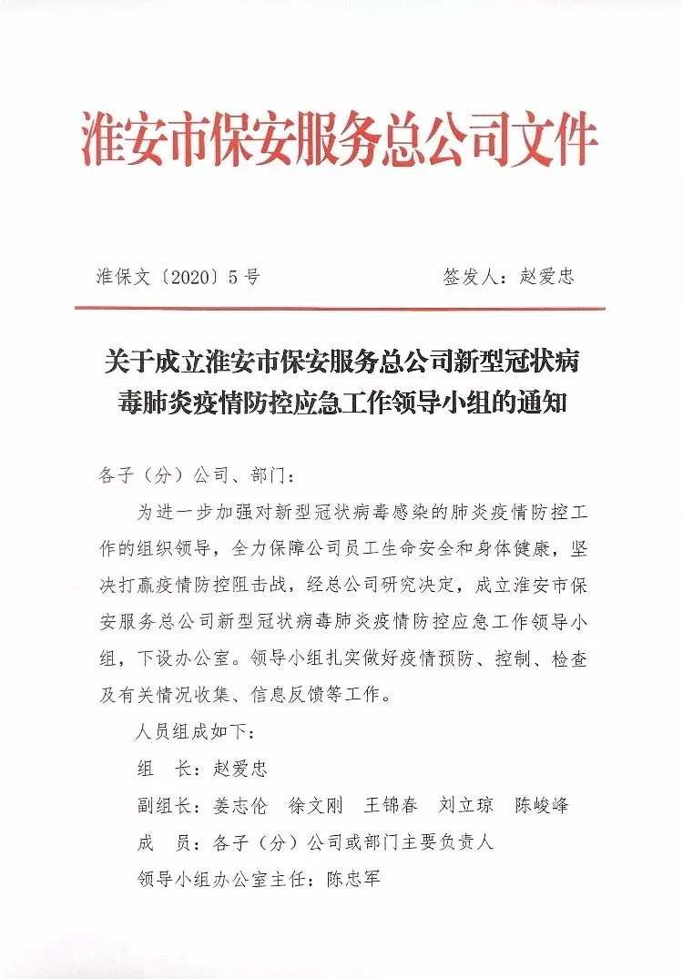 疫情就是命令,防控就是責(zé)任。總公司黨總支積極應(yīng)對(duì),超前部署,1月26日,總公司制定并下發(fā)《淮安市保安服務(wù)總公司新型冠狀病毒感染的肺炎疫情防控應(yīng)急預(yù)案》、《關(guān)于成立新型冠狀病毒感染的肺炎疫情防控應(yīng)急工作領(lǐng)導(dǎo)小組的通知》、《致全體黨員的一封公開信》。春節(jié)期間,總公司黨總支書記、總經(jīng)理趙愛忠等領(lǐng)導(dǎo)班子多次深入基層督導(dǎo)疫情防控工作。總公司利用微信群、工作群對(duì)疫情防范工作進(jìn)行再部署、再安排、再要求,要求各級(jí)管理人員要把疫情防控作為當(dāng)前最大的政治任務(wù),切實(shí)履職擔(dān)責(zé),認(rèn)真抓好疫情防控工作,做到全員宣傳到位、措施到位、防范到位。