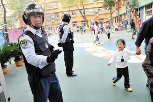 人民網(wǎng)·天津視窗10月11日電:頭頂防暴頭盔,身穿防刺背心,手袋防割手套,腰佩催淚瓦斯和橡膠警棍,天津濱海新區(qū)188所公辦中小學(xué)、幼兒園的保安全部被武裝起來(lái),在上下學(xué)時(shí)成為師生們的保護(hù)神。