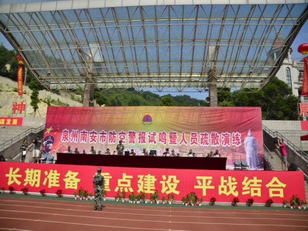 “我宣布,泉州南安市防空警報(bào)試?guó)Q暨人員疏散演練開(kāi)始!”隨著演練指揮長(zhǎng)南安市人民政府常務(wù)副市長(zhǎng)劉敏堅(jiān)發(fā)布命令,警報(bào)急促鳴響,操場(chǎng)上的各單位演練人員和600多名的實(shí)驗(yàn)中學(xué)師生迅速向指定防空地下室疏散掩蔽;隨后,現(xiàn)場(chǎng)各專業(yè)隊(duì)按照計(jì)劃和程序開(kāi)展救援、救護(hù)、消除空襲后果的各種演練和演示活動(dòng)。本次演練除了南安實(shí)驗(yàn)中學(xué)這個(gè)主會(huì)場(chǎng),還有分會(huì)場(chǎng)市區(qū)3個(gè)街道辦事處及15個(gè)重點(diǎn)鎮(zhèn)參與演練。