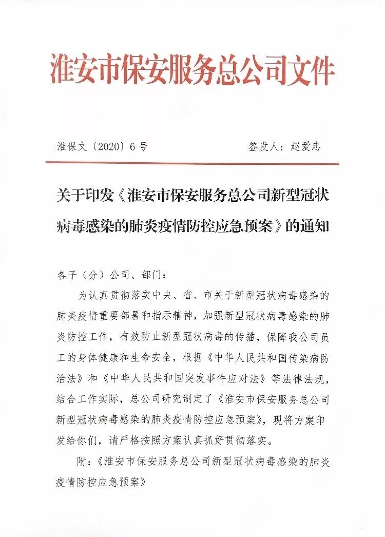 疫情就是命令,防控就是責(zé)任。總公司黨總支積極應(yīng)對(duì),超前部署,1月26日,總公司制定并下發(fā)《淮安市保安服務(wù)總公司新型冠狀病毒感染的肺炎疫情防控應(yīng)急預(yù)案》、《關(guān)于成立新型冠狀病毒感染的肺炎疫情防控應(yīng)急工作領(lǐng)導(dǎo)小組的通知》、《致全體黨員的一封公開信》。春節(jié)期間,總公司黨總支書記、總經(jīng)理趙愛忠等領(lǐng)導(dǎo)班子多次深入基層督導(dǎo)疫情防控工作。總公司利用微信群、工作群對(duì)疫情防范工作進(jìn)行再部署、再安排、再要求,要求各級(jí)管理人員要把疫情防控作為當(dāng)前最大的政治任務(wù),切實(shí)履職擔(dān)責(zé),認(rèn)真抓好疫情防控工作,做到全員宣傳到位、措施到位、防范到位。