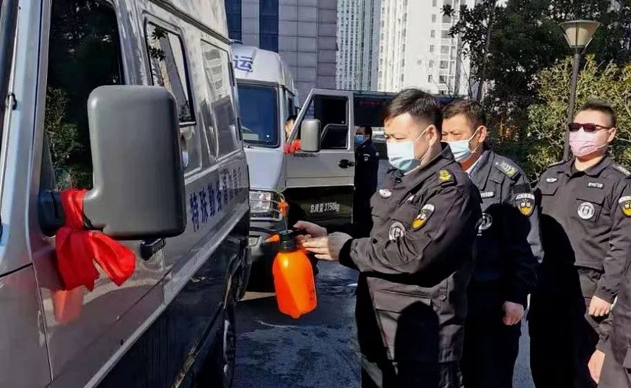 押運(yùn)隊(duì)伍在出車前和返回公司后,加強(qiáng)對(duì)個(gè)人裝備和運(yùn)鈔車的消毒工作,并安排專人每日對(duì)押運(yùn)裝備和押運(yùn)辦公場所進(jìn)行消毒,確保押運(yùn)過程零傳染。