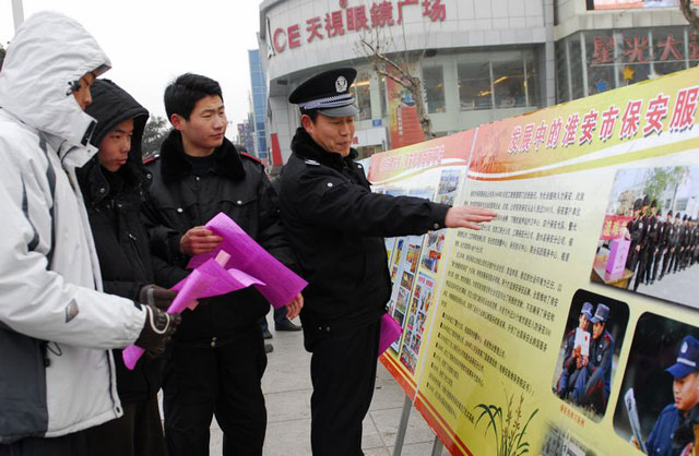 元月10日,是公安機(jī)關(guān)110宣傳日。當(dāng)日,總公司辦公室組織保安管理部、駐外保安部、押運(yùn)中心、培訓(xùn)部、技術(shù)防范部等部門,與公安機(jī)關(guān)一起在古順河體育館門前開展《保安服務(wù)管理?xiàng)l例》宣傳活動(dòng),通過拉橫幅、放展板、散資料等方式,廣泛宣傳保安條例,接受市民咨詢,深層次了解群眾對(duì)保安工作的需求和意見。