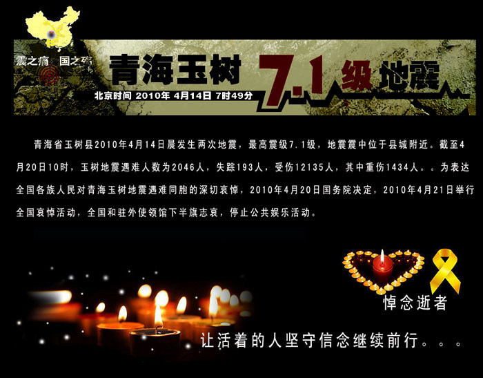 新華社4月20日電 為表達(dá)全國各族人民對青海玉樹地震遇難同胞的深切哀悼,國務(wù)院決定,2010年4月21日舉行全國哀悼活動,全國和駐外使領(lǐng)館下半旗志哀,停止公共娛樂活動。