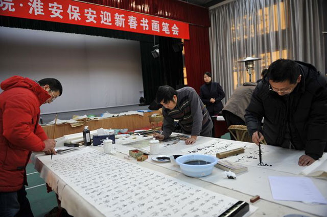 為表達書畫藝術(shù)界人士對保安隊伍的關(guān)愛,元月16日,淮安書畫院書畫家走進市保安公司進行新春慰問,書畫家們揮毫潑墨,作品寓意深刻,彰顯了保安文化特色,為保安員工奉獻了一份藝術(shù)大餐。