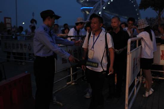 圖為:開幕式正式開始前,各出入口隊員做好安檢工作