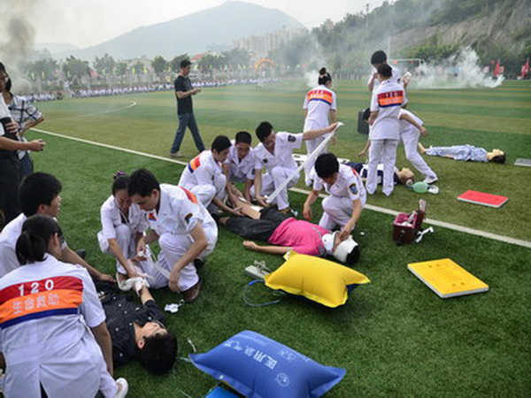 9月1日是泉州市解放63周年紀(jì)念日,泉州市人防辦每年都在這一天舉行一次防空警報(bào)試?guó)Q暨人員疏散演練活動(dòng),主會(huì)場(chǎng)在各縣市輪流舉辦,各縣市設(shè)立分會(huì)場(chǎng),今年的主會(huì)場(chǎng)設(shè)在南安市實(shí)驗(yàn)中學(xué)。上午9點(diǎn),泉州市人防辦、南安市人防辦在南安市實(shí)驗(yàn)中學(xué)舉辦的泉州南安市防空警報(bào)試?guó)Q暨人員疏散演練活動(dòng)準(zhǔn)時(shí)啟動(dòng),多種防空警報(bào)聯(lián)合試?guó)Q,防化專業(yè)隊(duì)、消防專業(yè)隊(duì)、預(yù)備役營(yíng)、治安巡邏專業(yè)隊(duì)、電力搶修專業(yè)隊(duì)、自來(lái)水搶修專業(yè)隊(duì)、醫(yī)療救護(hù)專業(yè)隊(duì)等多種人防專業(yè)隊(duì)參與救援演練。為確保演練取得成功,該市保安協(xié)警和校園專職保安及師生等700多人參與疏散演練。