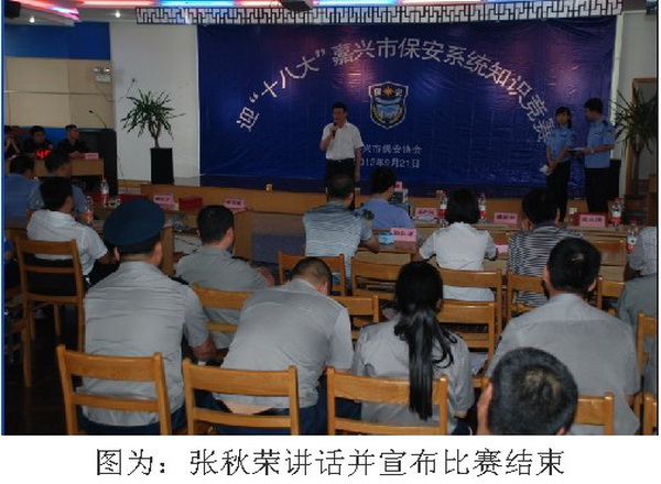 浙江省保安工作消息 為迎接黨的“十八大”順利召開,9月21日下午,浙江省嘉興市保安協(xié)會在嘉興市公安局人民警察培訓(xùn)學(xué)校舉辦了全市“保安系統(tǒng)知識競賽”。省公安廳治安總隊保安科科長、省保安協(xié)會秘書長傅志方,省公安廳治安總隊保安科壽俊杰,市保安協(xié)會常務(wù)副會長兼秘書長張秋榮,市保安服務(wù)公司總經(jīng)理、市保安協(xié)會副會長皇甫玉明等領(lǐng)導(dǎo)蒞臨現(xiàn)場觀摩指導(dǎo)。嘉興市公安局治安支隊政委潘新華和治安支隊副支隊長朱忠華分別致了比賽開幕詞和閉幕詞。由市局特警支隊政委陸永清等四人組成的評委團對比賽全程進行了監(jiān)督、評判。