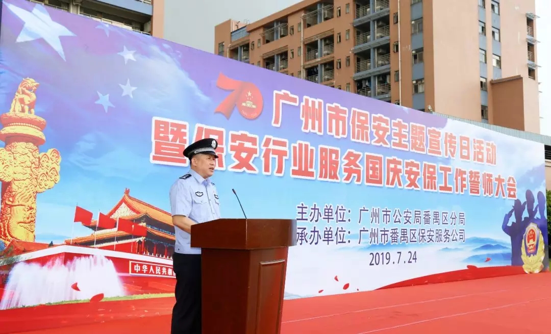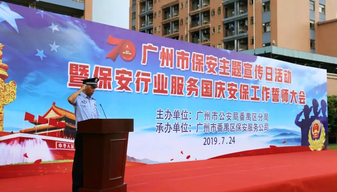 “不忘初心跟黨走,牢記使命勇?lián)?dāng)”。為扎實(shí)做好國慶70周年大慶安保維穩(wěn)工作,確保社會(huì)治安穩(wěn)定。7月24日上午,番禺區(qū)保安服務(wù)公司在公司運(yùn)動(dòng)場隆重舉行保安主題宣傳日活動(dòng)暨保安行業(yè)服務(wù)國慶安保工作誓師大會(huì)。廣州市公安局番禺區(qū)分局治安大隊(duì)葉文福副大隊(duì)長、三級警長何靖毅出席了大會(huì),公司黨支部書記謝燕彪、副書記陳志雄、委員溫遠(yuǎn)峰和300多名保安從業(yè)人員參加了大會(huì),大會(huì)由公司支部委員溫遠(yuǎn)峰主持。