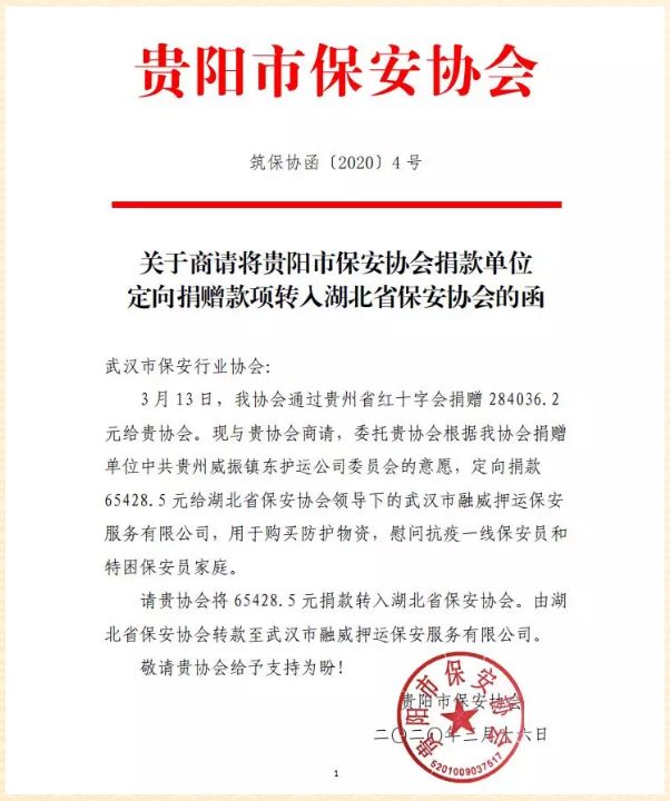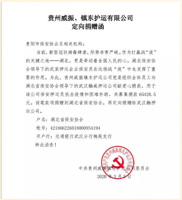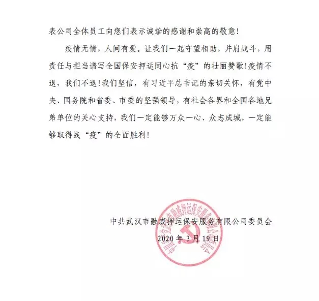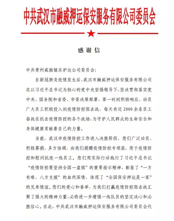 近日,貴州威振鎮(zhèn)東護(hù)運(yùn)公司黨委動(dòng)員組織廣大員工,積極為我公司募捐愛(ài)心捐款,用于疫情防控和慰問(wèn)抗疫一線員工,并經(jīng)多方協(xié)調(diào),將捐贈(zèng)專項(xiàng)款項(xiàng)送達(dá)到我公司。在武漢市疫情防控工作進(jìn)入決勝階段,貴州威振鎮(zhèn)東護(hù)衛(wèi)公司的愛(ài)心,為我們打贏疫情防控阻擊戰(zhàn)匯聚了強(qiáng)大的精神力量,必將進(jìn)一步增強(qiáng)一線隊(duì)員的堅(jiān)定決心和必勝信心。武漢市融威押運(yùn)公司黨委及全體員工對(duì)貴州威振鎮(zhèn)東護(hù)運(yùn)公司黨委和全體員工,以及提供協(xié)調(diào)支持的貴陽(yáng)市保安協(xié)會(huì)、湖北省保安協(xié)會(huì)和武漢市保安協(xié)會(huì)等機(jī)構(gòu),表示誠(chéng)摯的感謝和崇高的敬意!