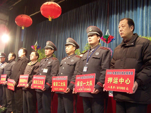 元月22日上午,總公司隆重召開“責(zé)任狀兌現(xiàn)暨春節(jié)安保工作會(huì)議”,會(huì)議對(duì)完成2005年任務(wù)指標(biāo)的9個(gè)部門受狀人頒發(fā)了責(zé)任狀獎(jiǎng)金,并對(duì)春節(jié)安全保衛(wèi)工作作了部署。武裝押運(yùn)中心、保安大隊(duì)及各部門300余人參加了會(huì)議。