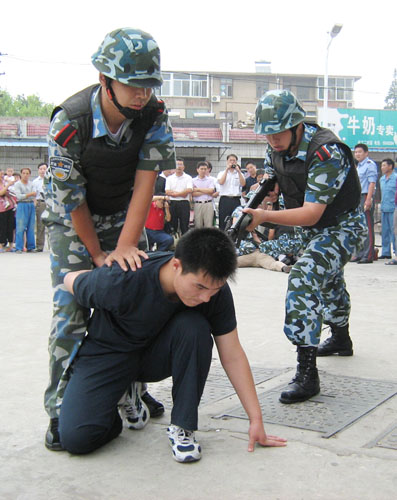 原來,這些驚險場面是由中國銀行淮安市淮鋼支行、清浦公安分局、市保安武裝押運護衛(wèi)中心聯(lián)合舉行的銀保“安全防范和應急處置金融系統(tǒng)及運鈔車遭受意外突發(fā)事件”時防暴模擬演習預案中的兩組鏡頭。