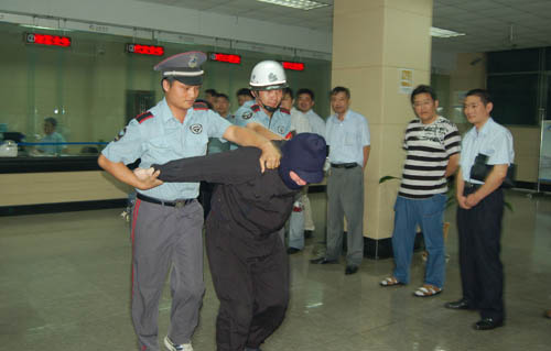 7月23日上午6時許,市區(qū)一家銀行營業(yè)大廳內(nèi),兩名手持炸藥包的“歹徒”突襲銀行工作人員并索要錢物,銀行保安與之發(fā)生了激烈搏斗,瞬間“歹徒”被勇敢的保安員“擒獲”。當(dāng)日,江蘇銀行淮安支行與市保安公司開展的多課目反搶劫演練,進(jìn)一步提高了保安員處置突發(fā)事件的能力。