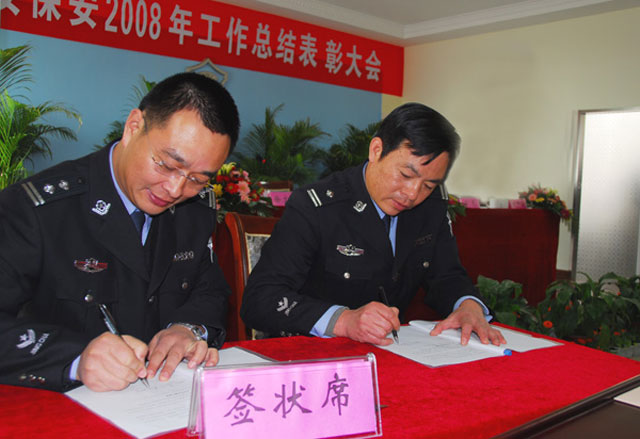 2月28日上午,在總公司召開的2008年度工作總結(jié)表彰大會上,婁伯翱總經(jīng)理與保安部、押運中心、技術(shù)防范部等14個部門簽定了2009年度工作目標(biāo)責(zé)任狀。