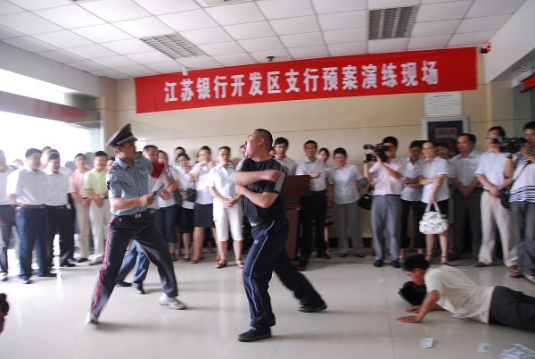 6月27日上午,江蘇銀行淮安分行會(huì)同市公安局、保安公司等部門在江蘇銀行開發(fā)區(qū)支行開展防搶劫預(yù)案演練,以增強(qiáng)武裝押運(yùn)員應(yīng)對(duì)突發(fā)性事件的處置能力以及公安機(jī)關(guān)快速反應(yīng)能力。