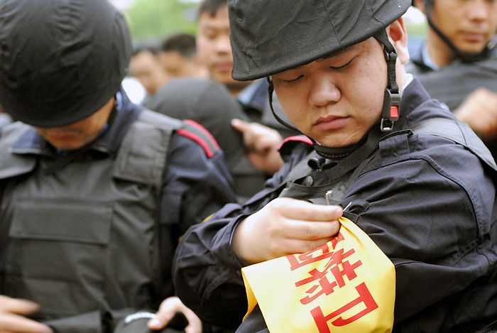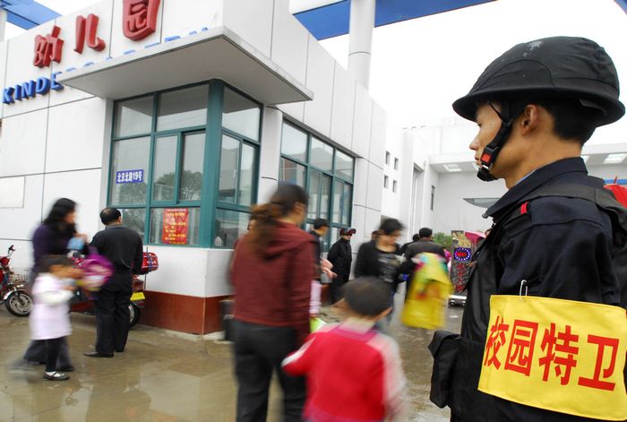 2010年5月5日早晨6時(shí)許,全副武裝的校園特衛(wèi)人員整裝待發(fā)。自當(dāng)日起,江蘇省淮安市首批46名配備鋼盔、防刺服、防割手套、防暴膠棒、滅火槍、催淚器等防護(hù)裝備的專(zhuān)職校園特衛(wèi)人員開(kāi)始進(jìn)駐市直23所中小學(xué)和幼兒園,守護(hù)校園平安。這些人員都是從全市保安隊(duì)伍中精選出來(lái)的骨干,年齡在35歲以下,大都有部隊(duì)服役的經(jīng)歷,身體素質(zhì)和政治素質(zhì)較好,且受過(guò)專(zhuān)業(yè)訓(xùn)練。