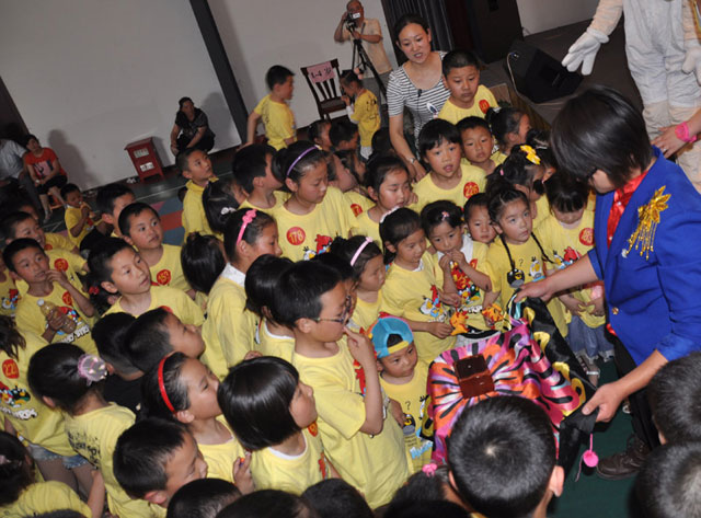 當(dāng)小朋友們還沒(méi)有從魔術(shù)的神奇中回過(guò)神來(lái),小丑哥哥的滑稽表演立即又吸引了孩子們的視線。小丑哥哥到臺(tái)上和大家一起玩《憤怒的小鳥(niǎo)》游戲,小丑哥哥滑稽的表演讓小朋友們哄堂大笑。彈射出的不僅是玩具娃娃,更給小朋友們送去了快樂(lè)和幸福。第四個(gè)是小游戲,《雙雙對(duì)對(duì)對(duì)》,讓小朋友們到舞臺(tái)上和卡通人物一起互動(dòng),孩子們圍成一個(gè)圓圈尋找伙伴,使陌生的孩子們擁抱在一起,尋找到友情,同時(shí)理解了團(tuán)結(jié)就是力量。變臉大師把國(guó)粹變臉的絕活展現(xiàn)得淋漓盡致,整個(gè)表演一氣呵成。