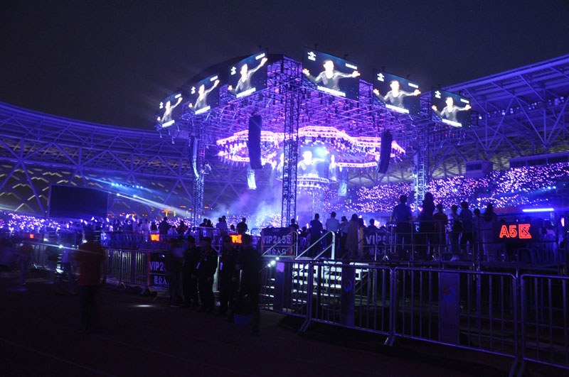 5月5日,“A CLASSIC TOUR學(xué)友·經(jīng)典世界演唱會(huì)”揚(yáng)州站,以人防中心王錦春總監(jiān)為領(lǐng)導(dǎo)管理班子,積極與主辦方聯(lián)絡(luò),在演唱會(huì)前一天,組織精干管理人員踏勘現(xiàn)場(chǎng),提出合理化安保建議,精心組織崗位分配,各項(xiàng)前期準(zhǔn)備工作有條不紊地開展。5日上午10時(shí),第一批100名大型活動(dòng)特勤安保隊(duì)伍進(jìn)駐揚(yáng)州體育公園,下午16時(shí),100名專業(yè)安檢員和特勤隊(duì)員準(zhǔn)時(shí)到達(dá)各預(yù)定崗位開展工作。在整場(chǎng)演唱會(huì)活動(dòng)中,安檢崗位中查獲各類違禁品5000余件。因主辦方設(shè)定預(yù)檢票口位置較少,造成大量觀眾聚集,我們合理調(diào)集機(jī)動(dòng)隊(duì)伍認(rèn)真做好人員疏散工作,避免了事故隱患。