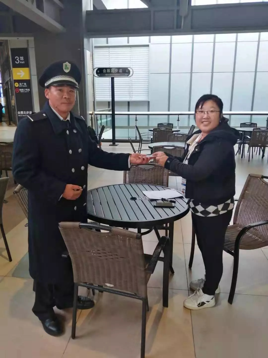 12月3日開(kāi)館當(dāng)天,隊(duì)員陳得彬在6.1號(hào)館3門巡查時(shí)拾到一部手機(jī),經(jīng)過(guò)尋找手機(jī)是兩位英國(guó)夫婦的,外國(guó)友人對(duì)陳得彬非常感謝,希望拍照紀(jì)念,臉上流露出滿意笑容。