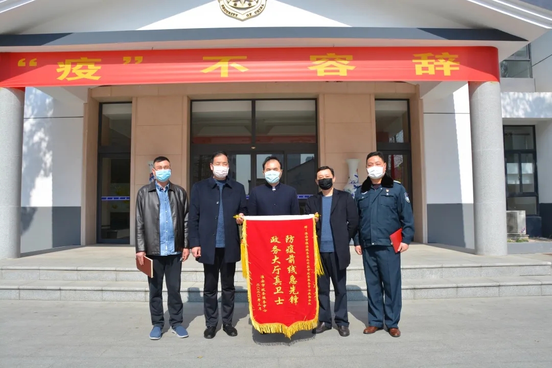 3月17日上午,淮安市行政審批局副局長(zhǎng)丁永祥,辦公室主任劉亞明專程來到總公司對(duì)在疫情期間派駐在政務(wù)中心的保安員們辛勤付出送上錦旗和感謝信,總公司副總經(jīng)理王錦春陪同。